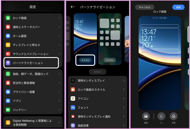 ロック画面をカスタマイズするには、【設定】>【パーソナライゼーション】>「ロック画面」の「カスタム」をタップします。