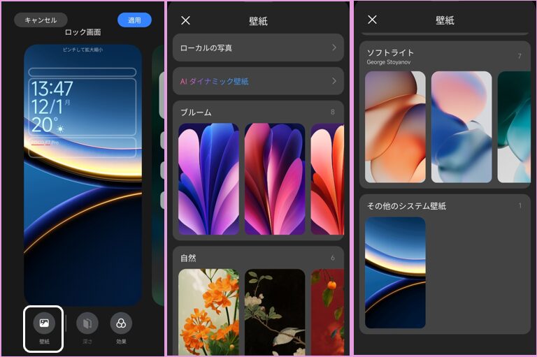 壁紙の変更は、カスタマイズ画面の下にある「壁紙」アイコンをタップして、ローカルの(端末内にある)写真やAIダイナミック壁紙やシステム壁紙から選択できます。