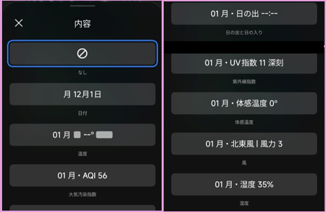 「日付」「温度」「大気汚染指数」「日の出と日の入り」「紫外線指数」「体感温度」「風」「湿度」から選択できます。