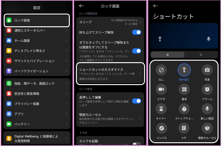【設定】>【ロック画面】>【ショートカットのカスタマイズ】から左右のショートカットを選択することができます。