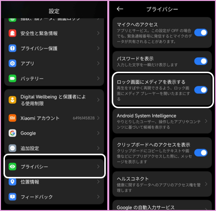 【設定】>【プライバシー】>「ロック画面にメディアを表示する」を有効にします。