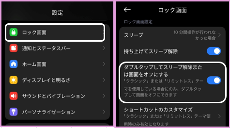 【設定】>【ロック画面】>「ダブルタップしてスリープ解除または画面をオフにする」を有効にします。