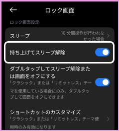 | 持ち上げてスリープ解除 | 有効にすると、画面OFFまたはAOD状態で、デバイスを持ち上げると画面ON(スリープ解除)になります。※2.3) | |