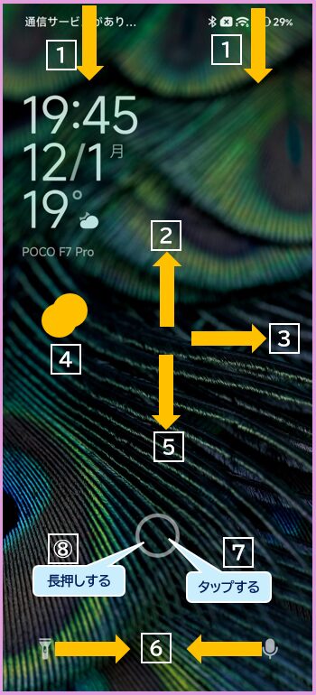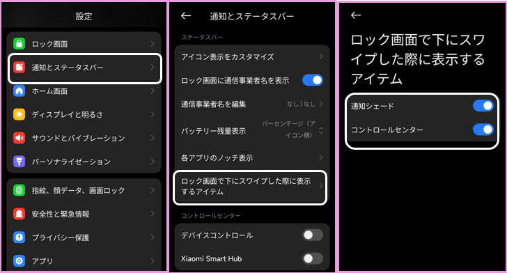 ※それぞれ開くには、設定が必要になります。【設定】>【通知とステータスバー】>【ロック画面で下にスワイプした際に表示するアイテム】をタップして、「通知シェード」「コントロールセンター」を有効にしておきます。