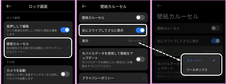「壁紙カルーセル」(ストーリー)あるいは「ツールボックス」が利用できます。