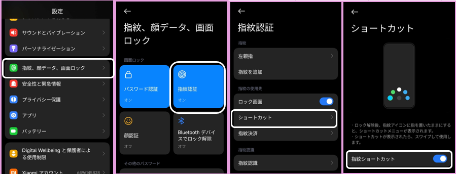 ※【設定】>【指紋、顔データ、画面ロック】>【指紋認証】>【ショートカット】で、「指紋ショートカット」を有効にしておきます。