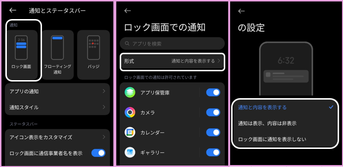 ロック画面と通知に関する設定は、【設定】>【通知とステータスバー】>【ロック画面】>【形式】にあり、「通知と内容を表示する」「通知は表示、内容は非表示」「ロック画面に通知を表示しない」から選択できます。