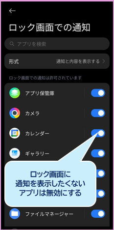アプリ単位で、ロック画面に通知表示を許可するかどうかの設定ができます。