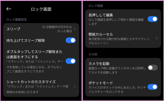 | ロック画面 | 長押しして編集 | 有効にすると、ロック画面を長押しして「ロック画面のカスタマイズ」をタップして、ロック解除すると、ロック画面のカスタマイズができる画面が表示されます。※1.参照 |