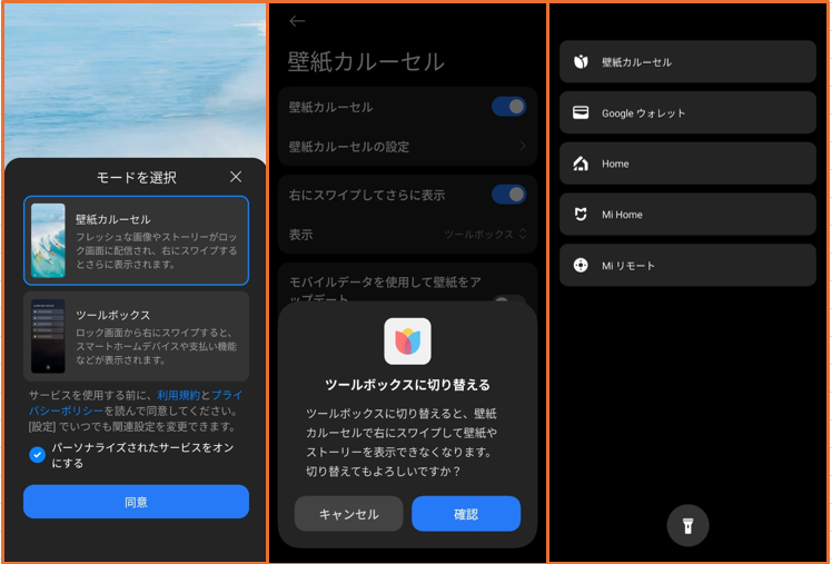 「ツールボックス」からは、「壁紙カルーセル」「Googleウォレット」「Home」「Mi Home」「Mi リモート」「懐中電灯」が動作します。