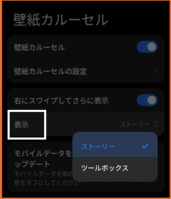 ※【設定】>【パーソナライゼーション】>【壁紙カルーセル】>「右にスワイプしてさらに表示」を有効にして、「表示」から「ストーリー」または「ツールボックス」を選択します。