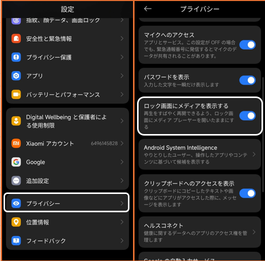 【設定】>【プライバシー】>「ロック画面にメディアを表示する」を有効にします。