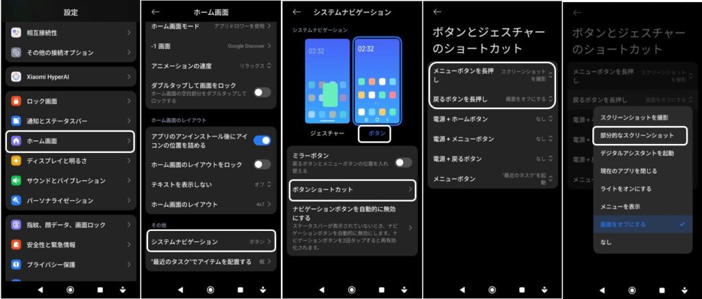 この方法も、HyperOS独自の機能で、ボタンナビゲーションの「◁」(戻るボタン)「▢」(メニューボタン)を長押ししたときに「部分的なスクリーンショット」機能を割り当てることができます。