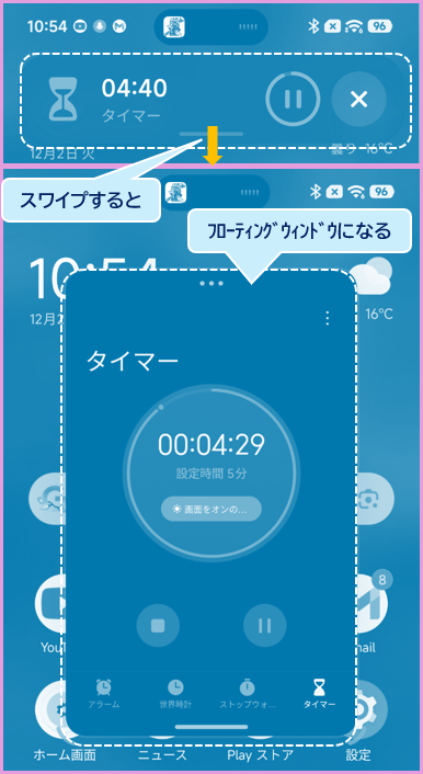 ・タイマー:停止/再開ができます。下にスワイプすると、フローティングウィンドウになります。