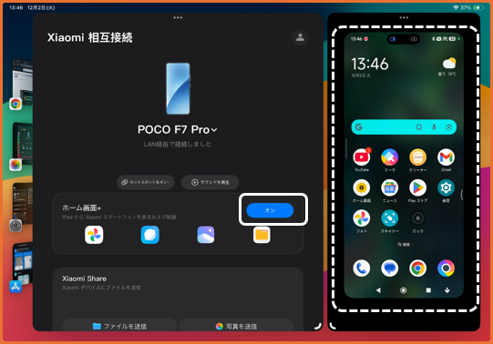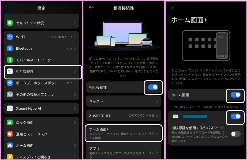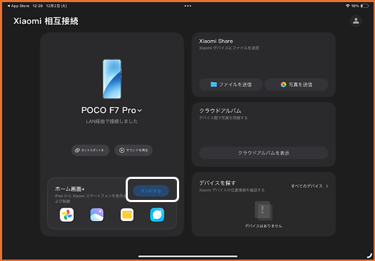 「Xiaomi相互接続」アプリを開いて、「ホーム画面+」を「オン」します。