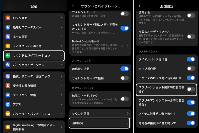 【設定】⇒【サウンドとバイブレーション】⇒【追加設定】⇒「スクリーンショット撮影時に音を鳴らす」トグルを左にスライドして無効にします。