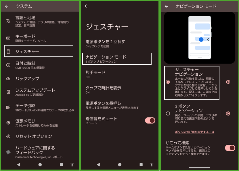 【設定】>【システム】>【ジェスチャー】>【ナビゲーションモード】から、「ジェスチャーナビゲーション」か「3ボタンナビゲーション」のどちらかを選択することになります。