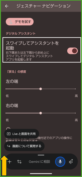 ※【設定】>【システム】>【ジェスチャー】>【ナビゲーションモード】>「ジェスチャーナビゲーション」の歯車アイコンをタップして、「スワイプしてアシスタントを起動」のトグルを右にスライドして有効にします。