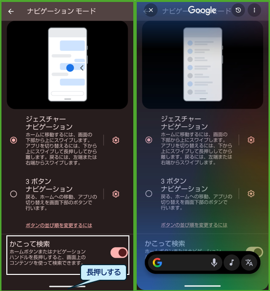 【ナビゲーションモード】の設定画面で、「かこって検索」を有効にして、ホームボタン「〇」を長押しします。