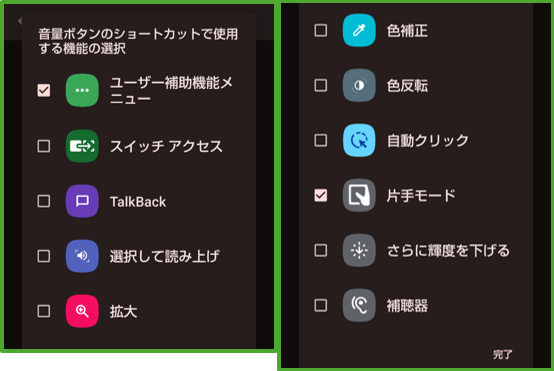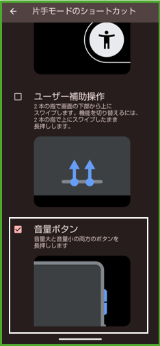 「片手モードのショートカット」をタップして、「音量ボタン」をチェックすると、音量ボタンの(大)(小)を同時に長押しすると、片手モードになります。
