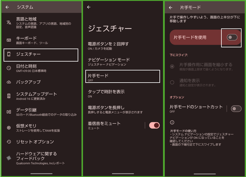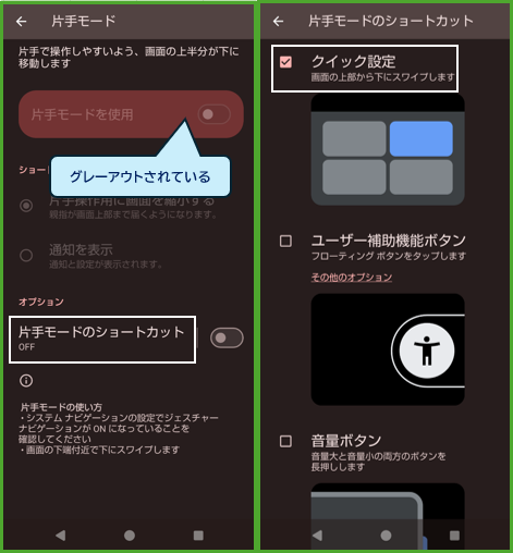 ・【設定】>【システム】>【ジェスチャー】>【片手モード】で、「片手モードのショートカット」をタップして、「クイック設定」をチェックします。