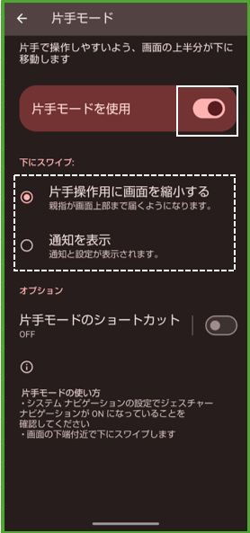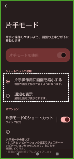 ・有効にしたら、【片手モード】画面に戻って、「片手操作用に画面を縮小する」または「通知を表示」を選択します。