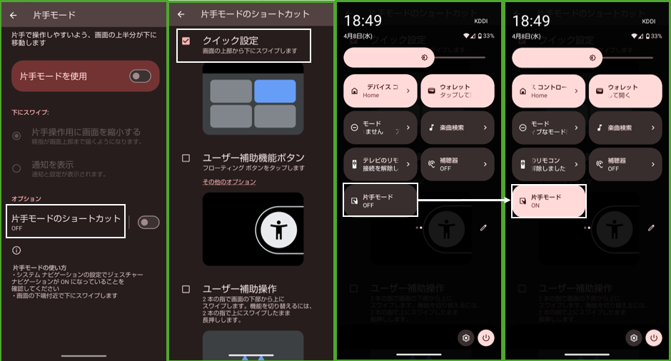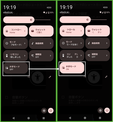 「クイック設定パネル」に「片手モード」の「タイル」を追加して、「タイル」のタップで「オン」/「オフ」の切り替えができます。
