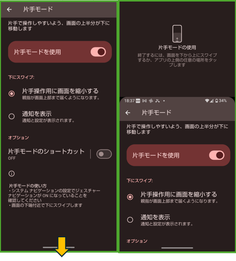 「片手モード」は、ユーザー補助機能のショートカットが利用できる機能のうちの一つになります。