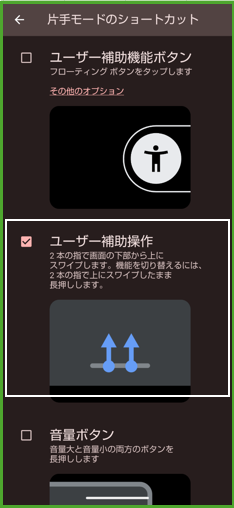 「片手モードのショートカット」をタップして、「ユーザー補助操作」をチェックすると、画面下部から、2本指で上にスワイプすると、片手モードになります。