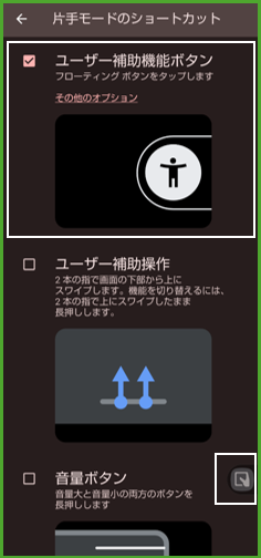 「片手モードのショートカット」をタップして、「ユーザー補助機能ボタン」をチェックすると、フローティングボタンが表示されるので、タップすると、片手モードになります。