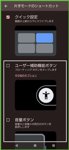 【片手モード】画面の「片手モードのショートカット」をタップして、「ユーザー補助機能ボタン」「音量ボタン」のいずれかをチェックします。