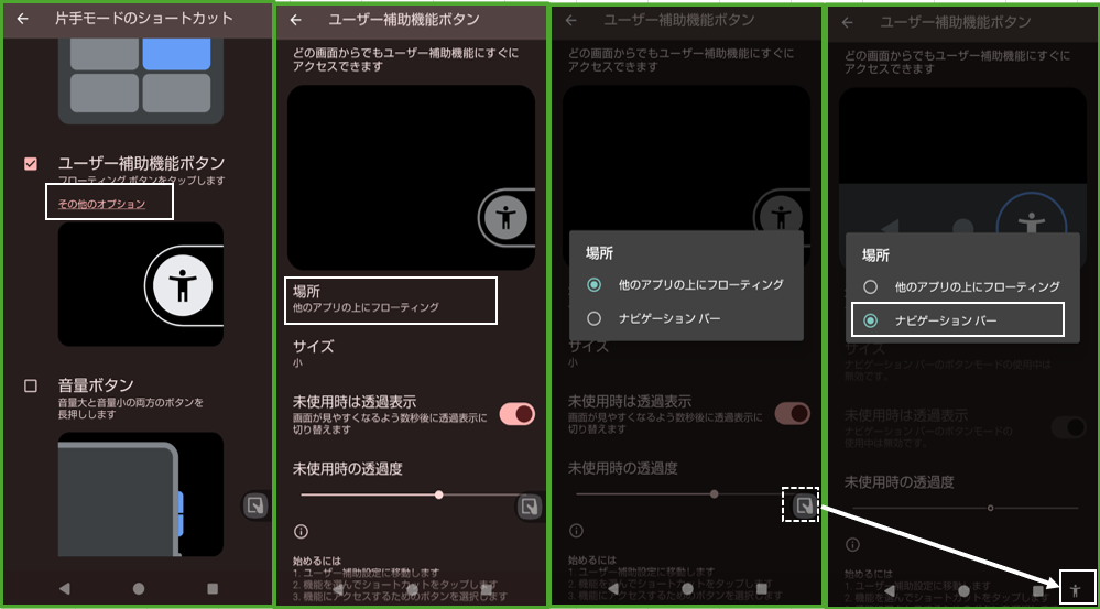 ・固定ボタン:「その他のオプション」>「場所」>「ナビゲーションバー」を選択すると、ナビゲーションバーの右に「ユーザー補助機能ボタン」が表示されます。タップすると、片手モードになります。