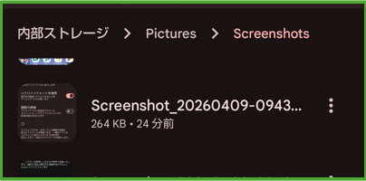 スクリーンショット画像の保存先は、 内部ストレージ>Pictures>Screenshots です。