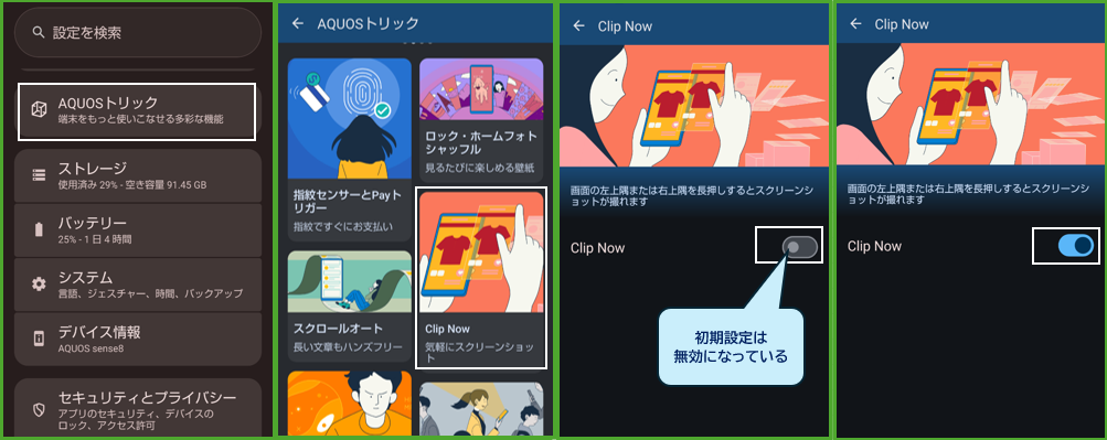 【設定】>【AQUOSトリック】>【Clip Now】>「Clip Now」トグルを右にスライドして有効にします。