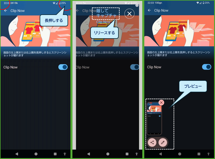 画面の右(または左)上隅を長押ししてリリースするとスクリーンショットが撮れます。