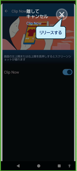 長押しして、途中でスクショを止めたいときは、「×」までドラッグして、リリースします。