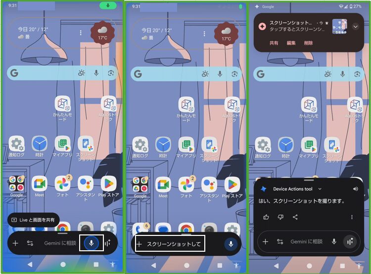 5.デジタルアシスタント「Gemini」を開いて「スクリーンショットして」と発声する