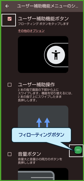 チェックすると、画面にフローティングボタンが表示されます。タップすると、ユーザー補助機能メニューが表示できます。