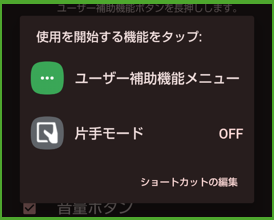 他の機能のショートカットが有効になっていないときに、ボタンをタップすると「ユーザー補助機能メニュー」がダイレクトに表示されます。