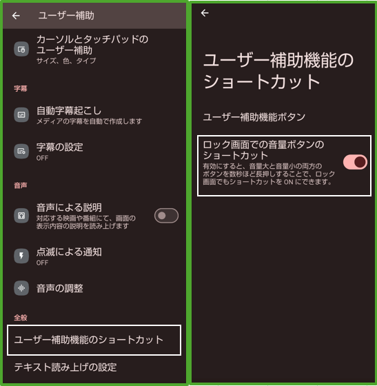 ※ロック画面からでも起動できるようにできます。【設定】>【ユーザー補助機能のショートカット】>「ロック画面での音量ボタンのショートカット」を有効にします。