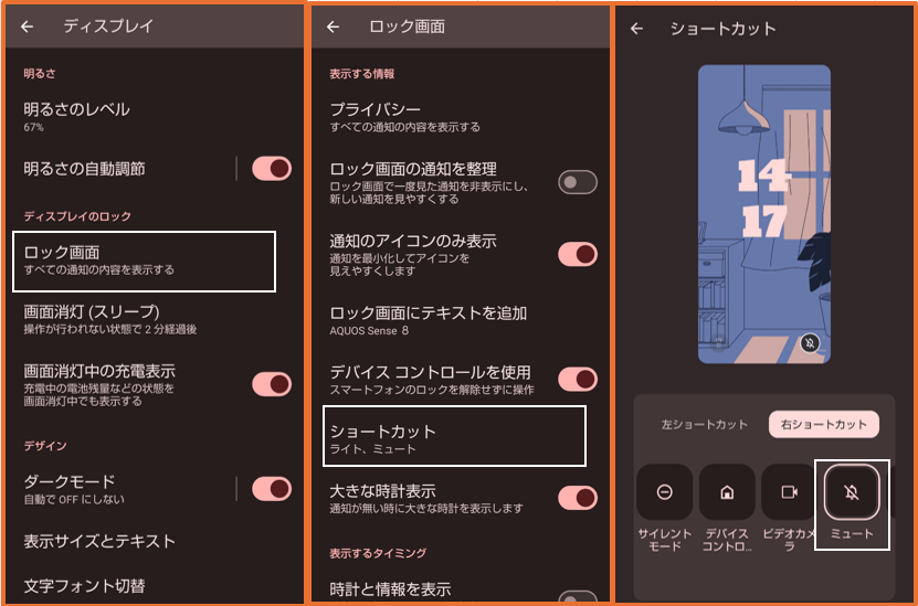 【設定】>【ディスプレイ】>【ロック画面】>【ショートカット】>「ミュート」を選択します。