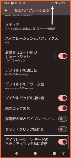 ただし、「バイブ」の通知アイコンを表示するには、設定が必要になります。