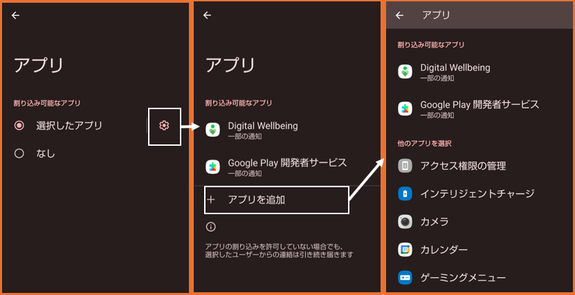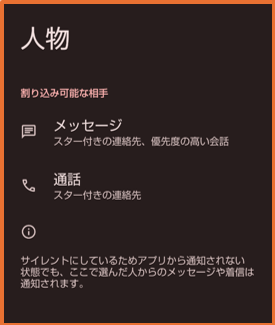 サイレントモードは、やみくもに、すべての着信・通知をブロックするのではなく、特定の人物からのメッセージや通話を許可したり、特定のアプリからの通知を許可することができます。