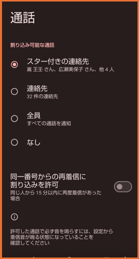 | スター付きの連絡先 | スター付きの連絡先に登録してある電話番号からのみ着信を許可します。 |