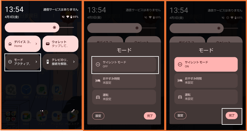 【クイック設定パネル】を開いて、「モード」タイルをタップして、「サイレントモード」をタップして、「完了」をタップします。