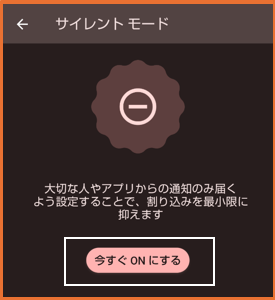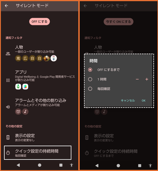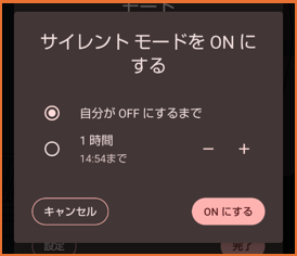 「毎回確認」を選択していると、「サイレントモード」をオンにしたときに、「OFFにするまで」か時間を選択してから「オン」にできます。
