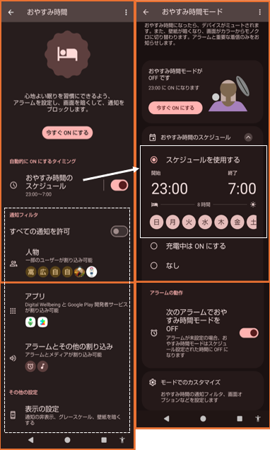 「おやすみ時間」モードは、時間帯を指定して「サイレントモード」にすることができる機能だと考えるとわかりやすいと思います。