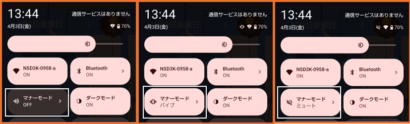 【クイック設定パネル】を開いて、「マナーモード」タイルをタップすると、タップごとに、【OFF】⇒【バイブ】⇒【ミュート】に切り替わります。