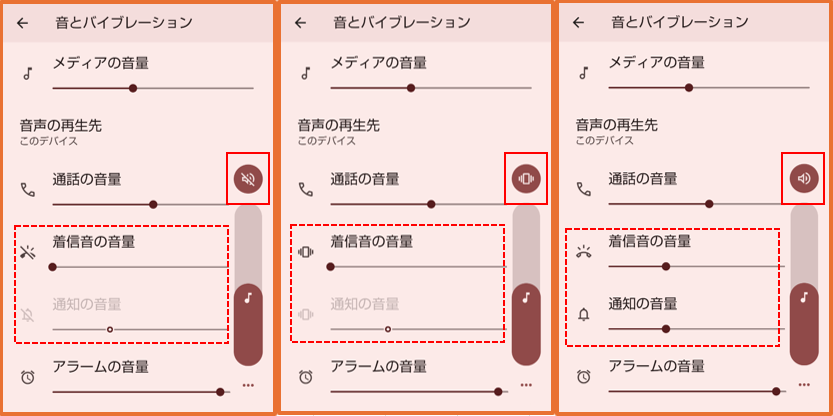 | 着信・通知時の音 | 鳴らない | 鳴らない | 設定している音量で鳴る |