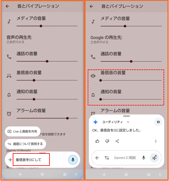 「Gemini」を開いて、「着信音をゼロにして」と発声します。この場合、マナーモードのステータスは「バイブ」になります。